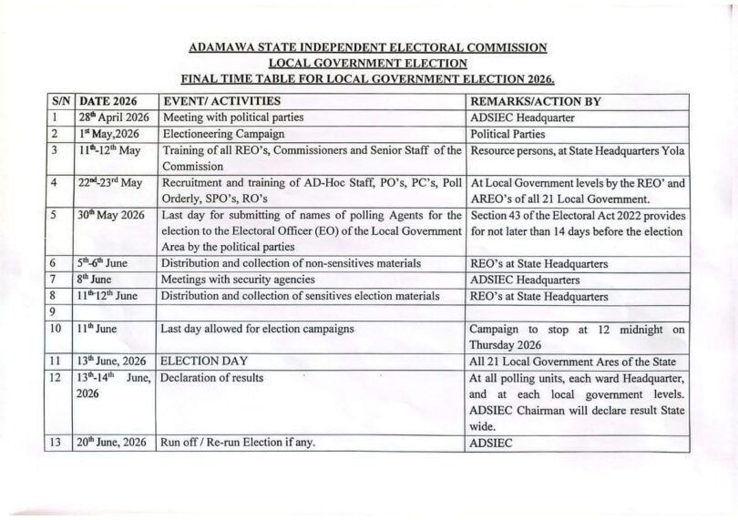 The Adamawa State Independent Electoral Commission ADSIEC has fixed June 13, 2026, for the conduct of local government elections across the state’s 21 local government areas, according to the official timetable released by the commission.