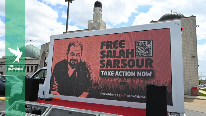 A digital billboard shows a photo of Salah Sarsour as protesters gather outside the Mosque Foundation to demand his release on 19 April 2026, in Bridgeview, Illinois, US. [Getty]