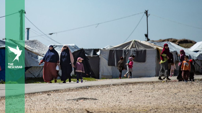 Women with children walk at Camp Roj, where relatives of people suspected of belonging to the Islamic State group are held, 28 March 2021. [Getty]