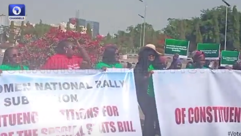 A large group of women on Wednesday gathered at the entrance of the National Assembly, calling on lawmakers to support a bill that seeks to create special seats for women in both state and national legislatures.