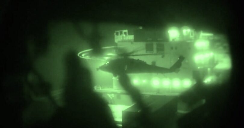 In the clips, a helicopter can be seen circling the ship ahead of the Marines’ entering.