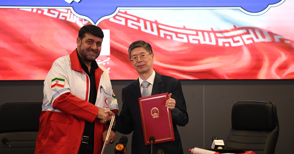 (260419) — TEHRAN, April 19, 2026 (Xinhua) — Chinese Ambassador to Iran Cong Peiwu (R) and Iranian Red Crescent Society (IRCS) President Pirhossein Kolivand attend a signing ceremony for the handover certificates of China’s emergency humanitarian assistance to Iran in Tehran, Iran, April 15, 2026. China has decided to provide 58 tonnes of emergency humanitarian assistance to Iran, a Chinese envoy said recently.