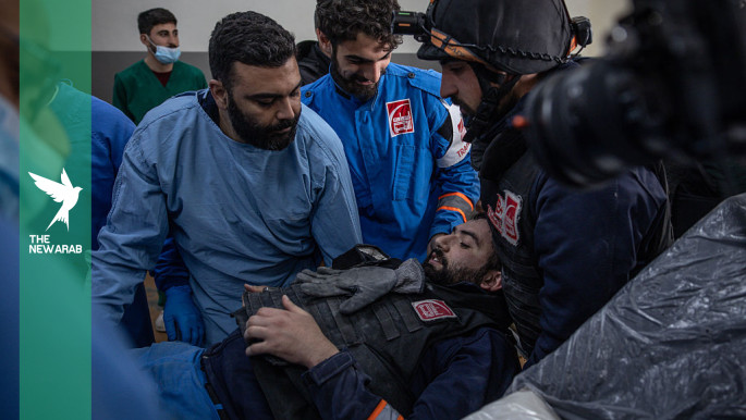 Paramedic Khodor Obeid lis brought to hospital by his colleagues after he sustained a leg injury while responding to building destroyed in an Israeli airstrike on 4 April 2026 in Nabatieh, Lebanon. [Getty]