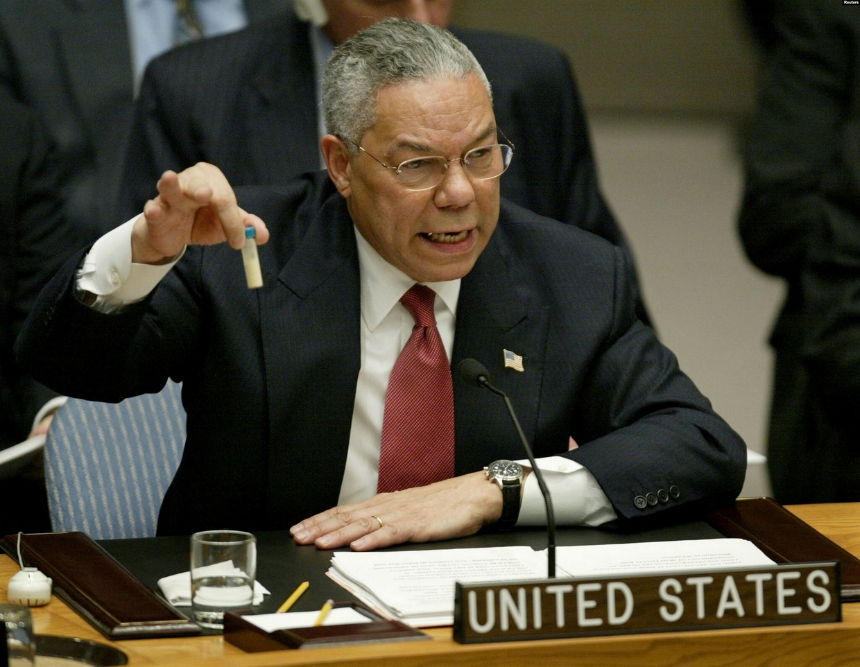 The image of the US Secretary of State holding up a small model vial to illustrate the alleged massive threat – suggesting that even a tiny amount of anthrax could kill thousands – has become indelibly etched in the public memory.