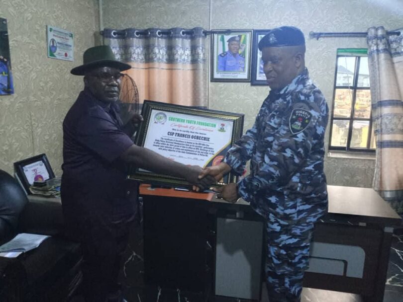 The Southern Youth Foundation of Nigeria has honoured the Divisional Police Officer (DPO) of Mile One Diobu Division, CSP Francis Ogbechie, in recognition of his contributions to effective policing and peaceful coexistence in Rivers State.