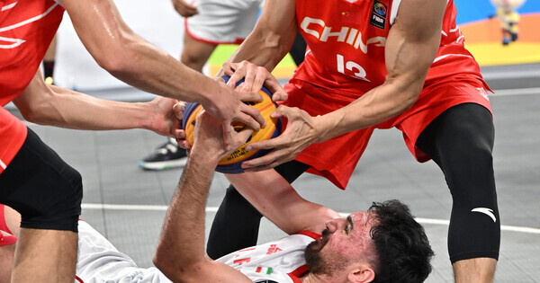 (260425) — SANYA, April 25, 2026 (Xinhua) — Mohammadmahdi Rahimi (bottom) of Iran competes during the 3×3 basketball men’s group A match between China and Iran at the 6th Asian Beach Games in Sanya, south China’s Hainan Province, April 25, 2026. (Xinhua/Guo Cheng)