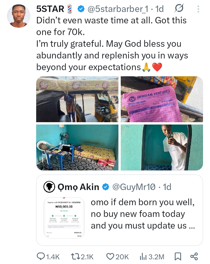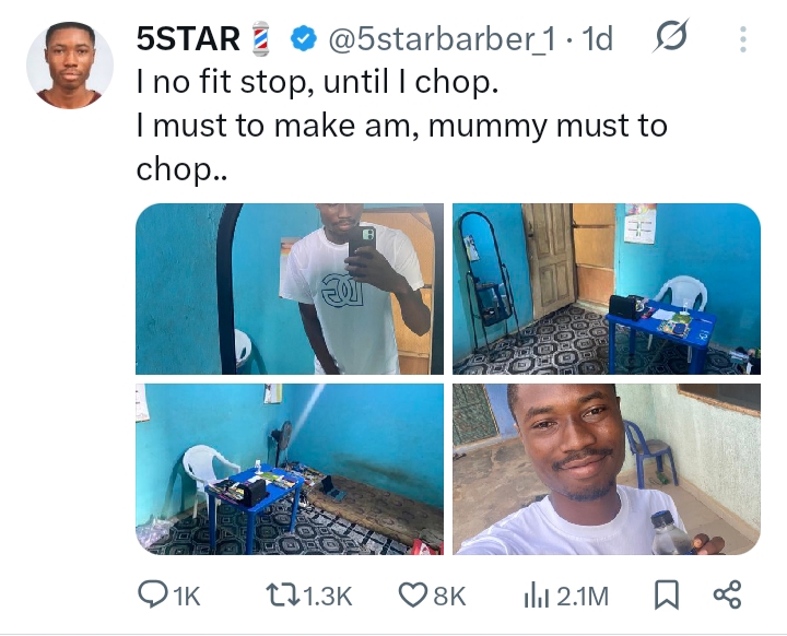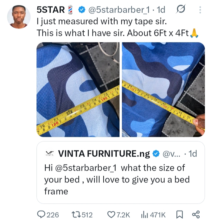 The young man identified as 5starbarber_1 took to the micro blogging platform X to share a photo of his room, which captured the scanty space and the squalid mattress he uses.