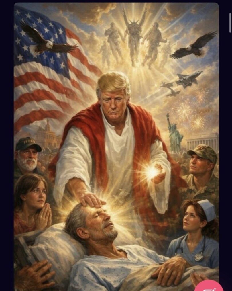 In the image shared on his Truth Social, Trump dressed in a white garment with a red robe and surrounded by radiant light, while seemingly performing a healing.