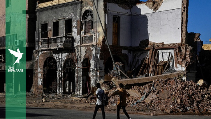 Sudanese men walk past destroyed buildings in the capital Khartoum, as the war enters its fourth year [Getty]