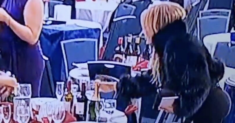 The woman’s identity is not immediately clear, and it’s not apparent whether it was alcohol she had already paid for. There is no suggestion of any wrongdoing.